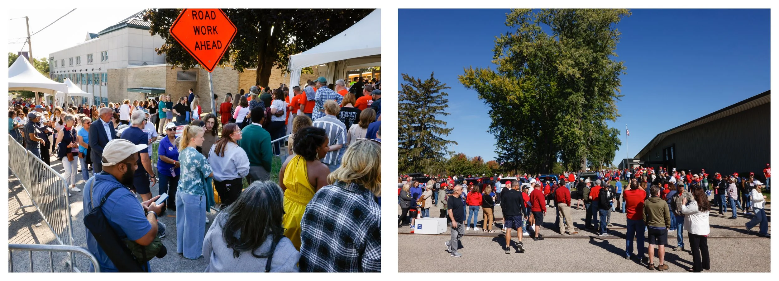 Left: A line of Harris supporters hoping to enter her October campaign rally at Ripon College stretches down multiple city blocks.