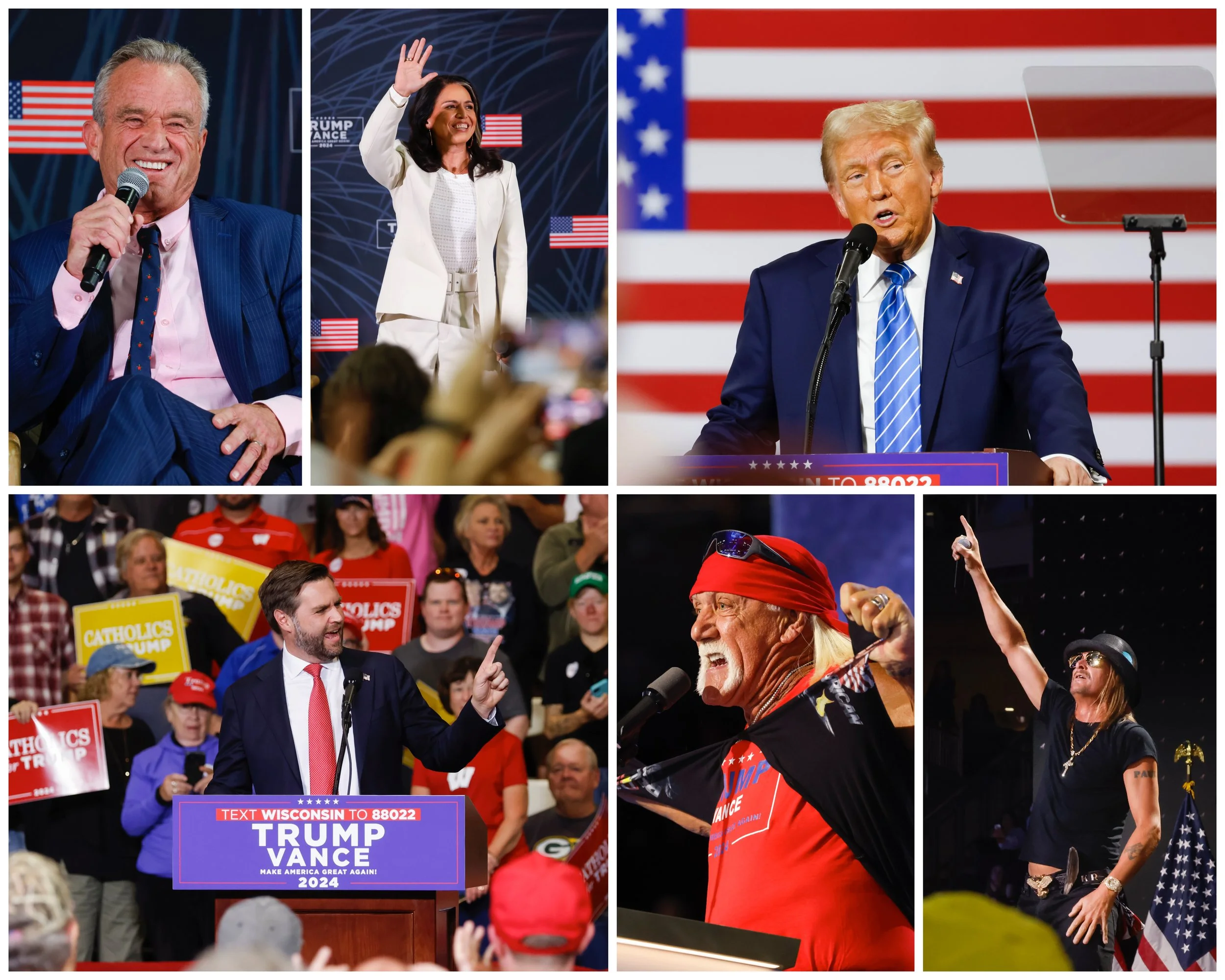 The Trump-Vance campaign presents a familiar cast of characters, including former WWE star Hulk Hogan and musician Kid Rock, during the last rallies of the election cycle. Robert F. Kennedy Jr., who was vying for the presidency, stumped for Donald Trump, who has since nominated Kennedy for U.S. health and human services secretary. Pictured in the top row, left to right, are Kennedy, former Rep. Tulsi Gabbard (now nominated for director of national intelligence) and Trump. Bottom row, left to right, are now Vice President-elect JD Vance, Hogan and Kid Rock.