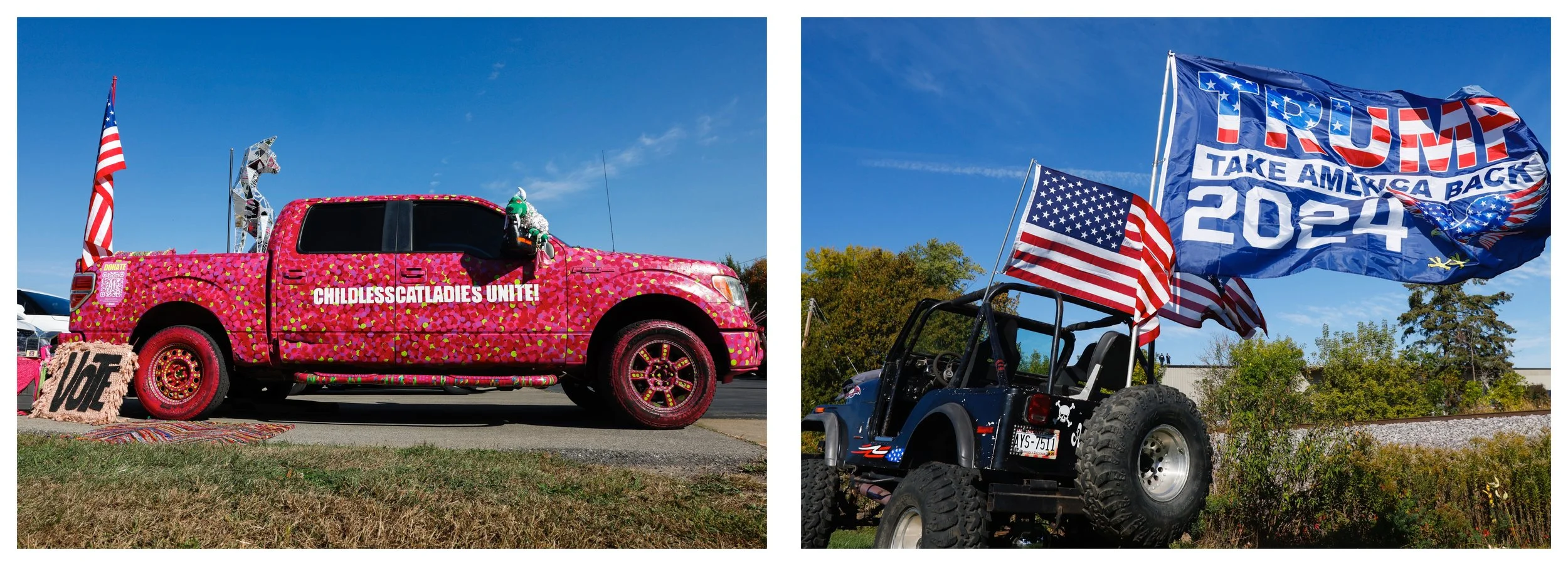 Left: “Childless cat ladies unite!” is displayed on the WomenRoar24 truck near a campaign rally for Kamala Harris in Ripon in October. The phrase refers to Republican Vice President-elect JD Vance’s 2021 Fox News interview, in which he said the U.S. was being run by Democrats, corporate oligarchs and "a bunch of childless cat ladies who are miserable at their own lives and the choices that they've made and so they want to make the rest of the country miserable, too." The phrase became a tool to rebuke Vance’s criticism of people without children.