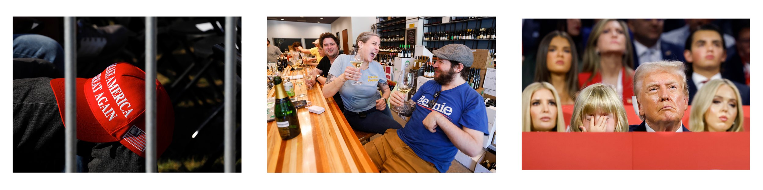 Right: Democrats gather at Minoqua Brewing Taproom in Madison to watch the vice presidential debate on a large screen while drinking beverages with liberal names like “MAGA Tears.”