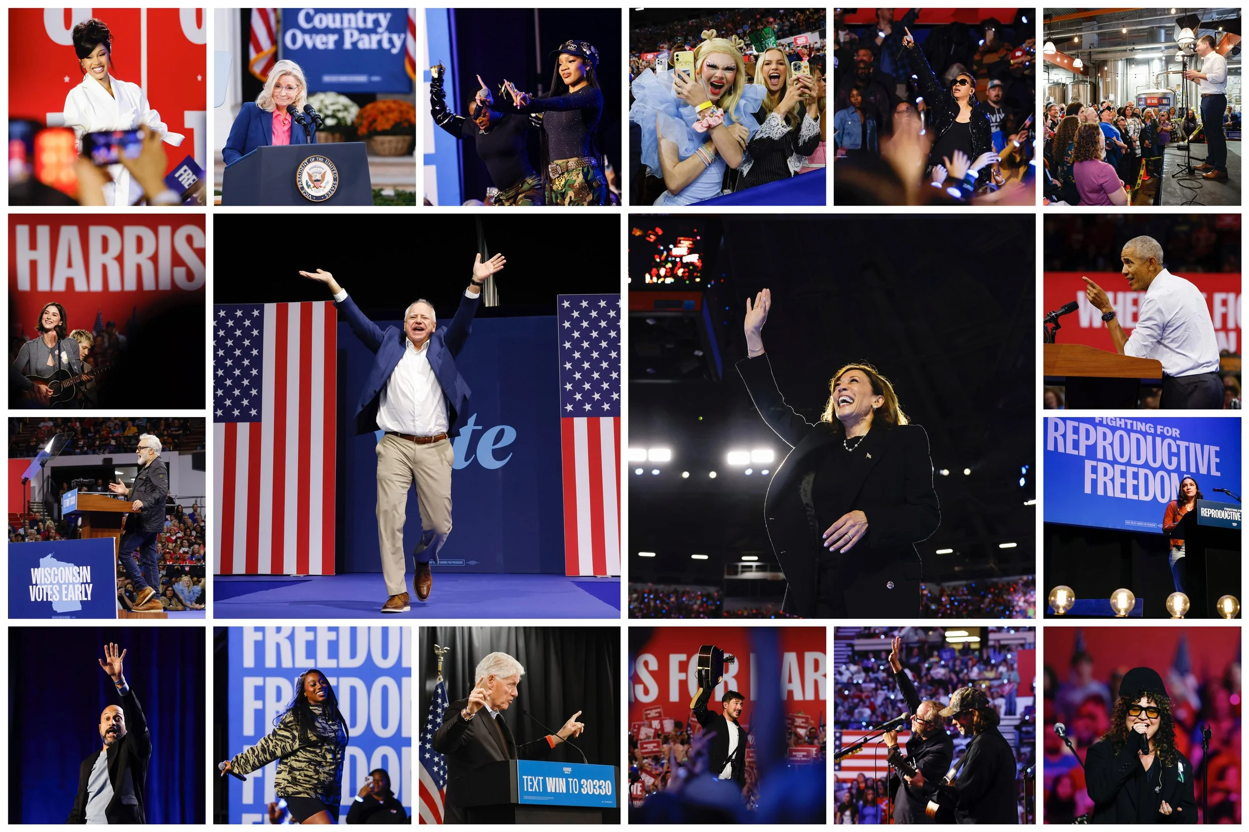 The Harris-Walz campaign spent the last week before the Nov. 5 election bringing out as many celebrities and high-level politicians as they could for concerts and rallies in swing states. In addition to those who came to Wisconsin and are pictured above, actresses and musicians such as Jennifer Lopez, Beyoncé, Kerry Washington, Bruce Springsteen, Stevie Wonder, Willie Nelson, Oprah, Maggie Rogers and Jennifer Garner joined Harris on the campaign trail in October and November. Clockwise from upper left are rapper Cardi B, former U.S. Rep. Liz Cheney, rapper GloRilla, social influencers Nemo and Ava Ernst, rapper MC Lyte, U.S. Transportation Secretary Pete Buttigieg, former President Barack Obama, U.S. Rep. Alexandria Ocasio-Cortez, musicians Remi Wolf, Matt Berninger and Aaron Dessner from the band The National, Mumford & Sons, former President Bill Clinton, rapper Flo Milli, actor and comedian Keegan-Michael Key, actor Bradley Whitford and singer-songwriter Gracie Abrams. Center left is Democratic vice presidential candidate Tim Walz and center right is Vice President Kamala Harris.