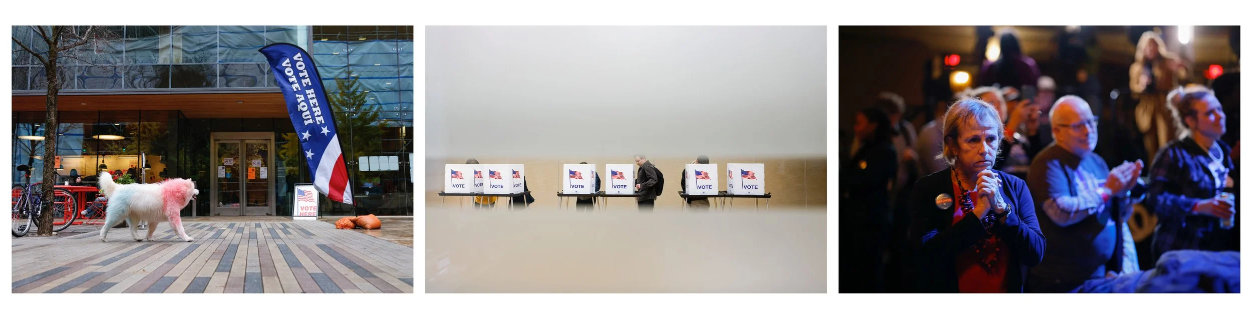 Left: A dog named Tike — with his fur dyed red, white and blue — walks past the polling place at Chazen Museum at the University of Wisconsin-Madison on Election Day. Tike’s owner said the dog was dressed to look like a Bomb Pop ice treat.