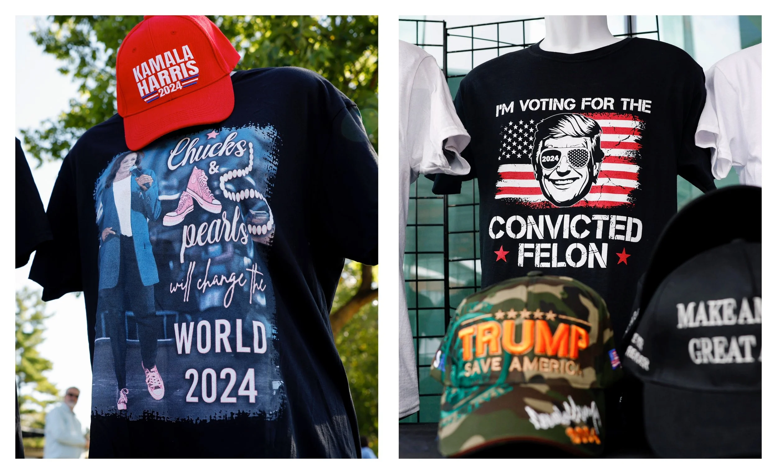 Left: A shirt displayed on a merchandise table reads, “Chucks and pearls will change the world 2024” outside of a Kamala Harris campaign rally at Ripon College in October.